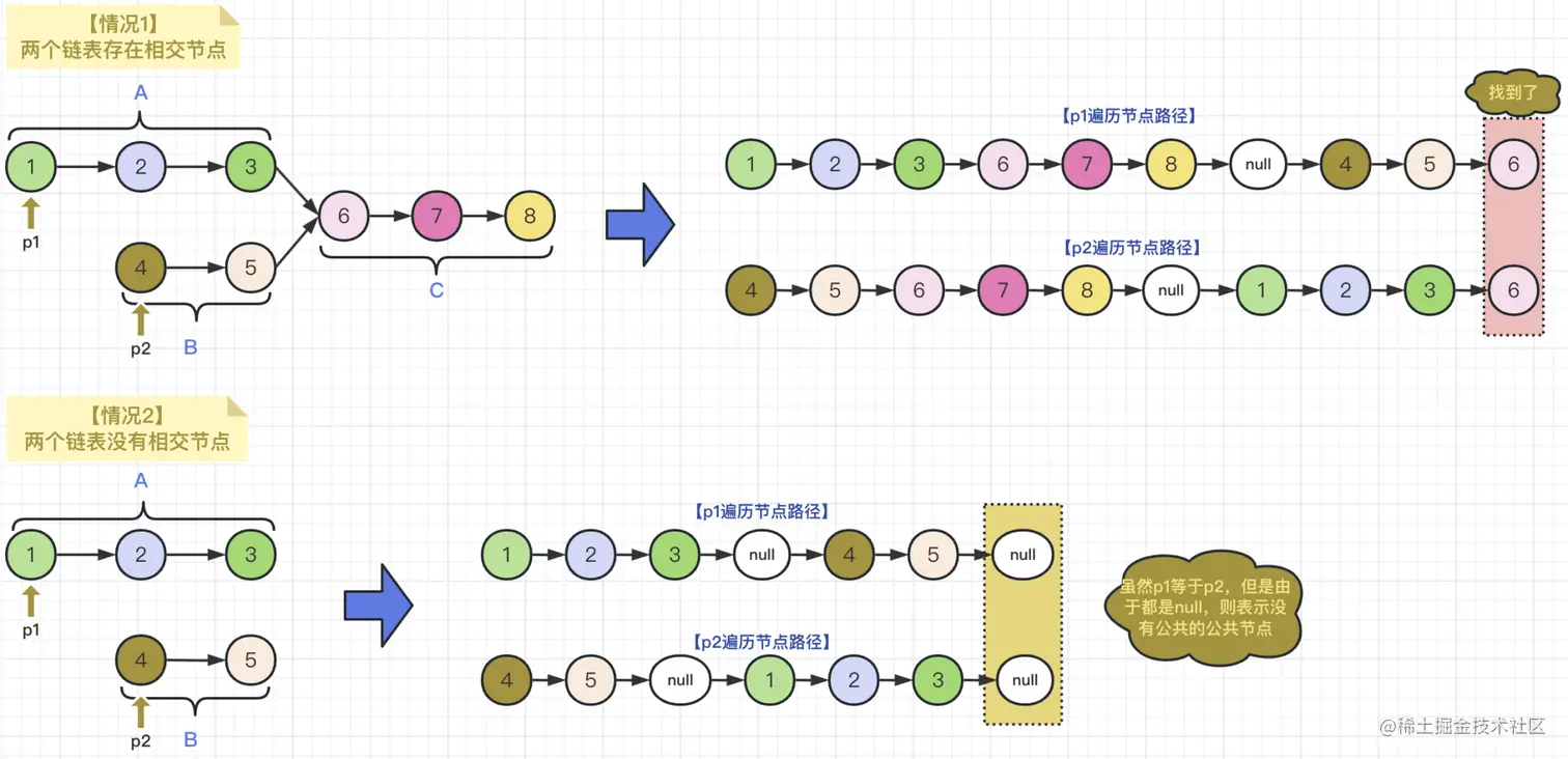 针对链表相交的情况,我们可以见下图所示,创建两个指针p1和p2,分别指向两条链表的起止节点,我们假设无论p1还是p2都会遍历完两条链表,那么我们会发现,它们最终遍历的长度一定是相同的,即:会在某个遍历步骤下相遇;而因为我们将null也作为了一种节点,所以,当两条链表是平行的话,最终他们也都会指向null值这个虚拟节点上了。为了方便大家理解,这两种情况均在下图示例了出来,为了加深理解,请见下图所示: