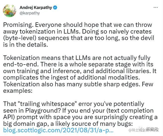 这是非常有希望的,每个人都应该希望我们能在大模型中扔掉标记化,也不需要那些过长字节的序列。