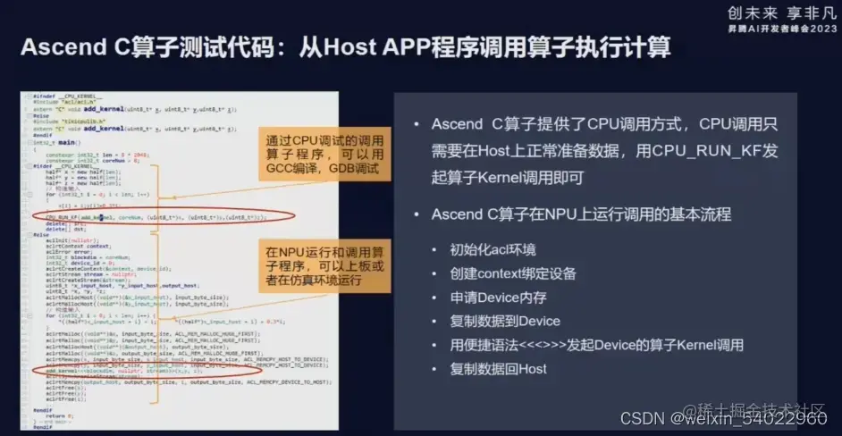 下图讲述的是直接调用核函数的方式进行算子代码测试的。包括CPU和NPU两种测试方法,通过“CCE_KT_TEST”宏定义区分是运行在CPU上的代码还是NPU上的代码。