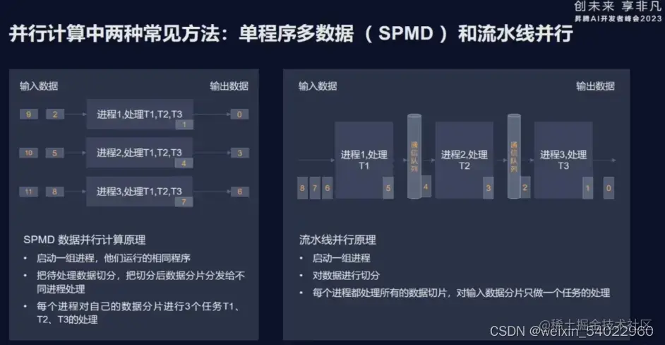 下面这张图,讲述了并行计算中的两种常见方法:SPMD和流水线,这两种方法都会提现到Ascend C的编程模型和编程方法中。