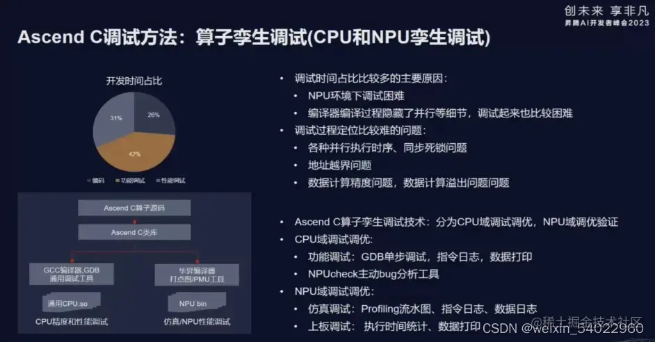 TIK C算子的调试手段丰富,可以在CPU,也可以在NPU上调试。这就是算子的孪生调试技术。