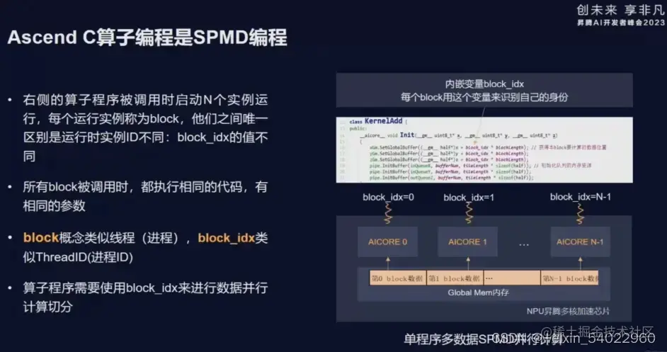 核函数体现的是SPMD的编程思想,同时简化了用户的代码实现。开发代码时,只需要写单个AI Core核的实现代码。