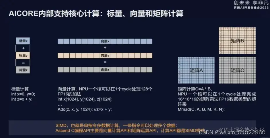 下面这张图讲述了一个Aicore的内部的计算单元,其中的向量和矩阵计算单元都是单指令多数据计算,也就是一个指令周期可以实现一组数据的加和乘。