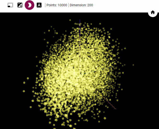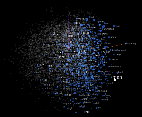 上图是10000个词汇,经过200个维度的描述处理后,投射到3维空间所呈现的视觉效果。