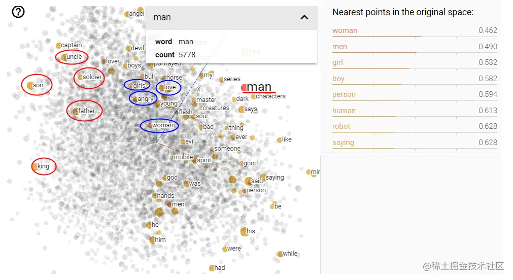 其中有“son”、“uncle”、“father”、“king”这些词。这可能是从角色维度来分析的,看它们都凑一堆儿。
