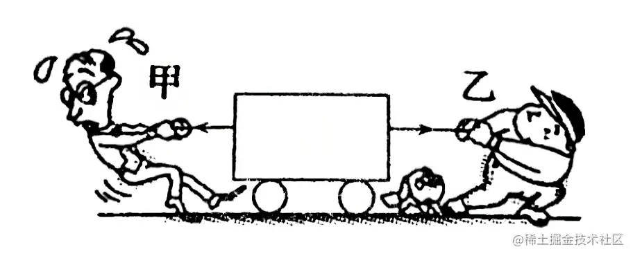 上图所示,两人拉车。一个向左,一个向右。瘦子力气小,胖子力气大。力是向量,它有方向和大小。