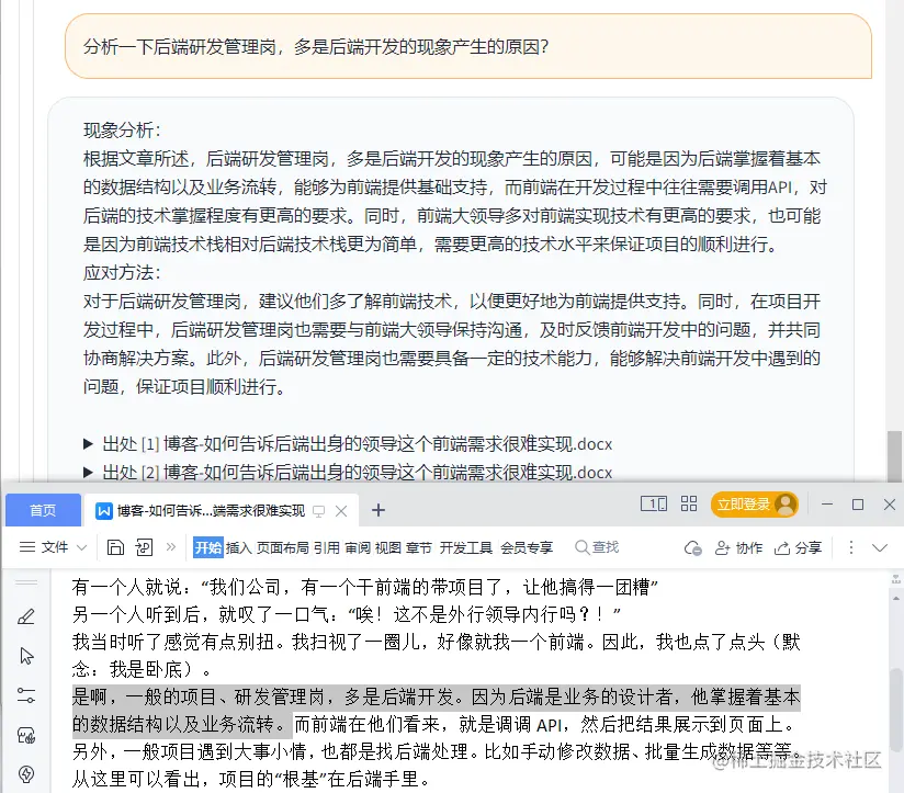 依托于词向量,我们可以实现从文档中找答案。我把上一篇博客《如何告诉后端出身的领导,前端需求难实现》导入知识库,然后问它文中的问题。它是能回答出来的。