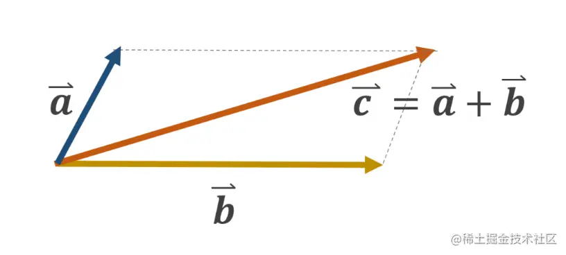 有一个著名的平行四边形法则:向量a和向量b一起使劲,作用等同于向量c。