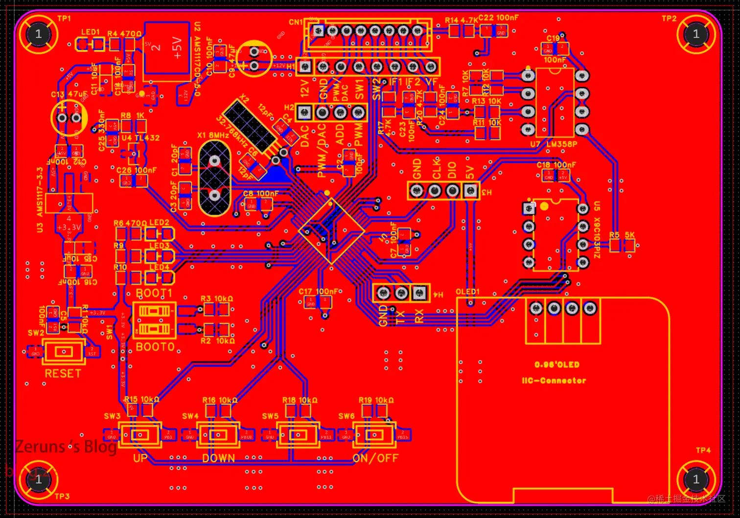 - STM32F030C8T6最小系统板和流水灯(原理图和PCB):blog.zeruns.tech/archives/71…