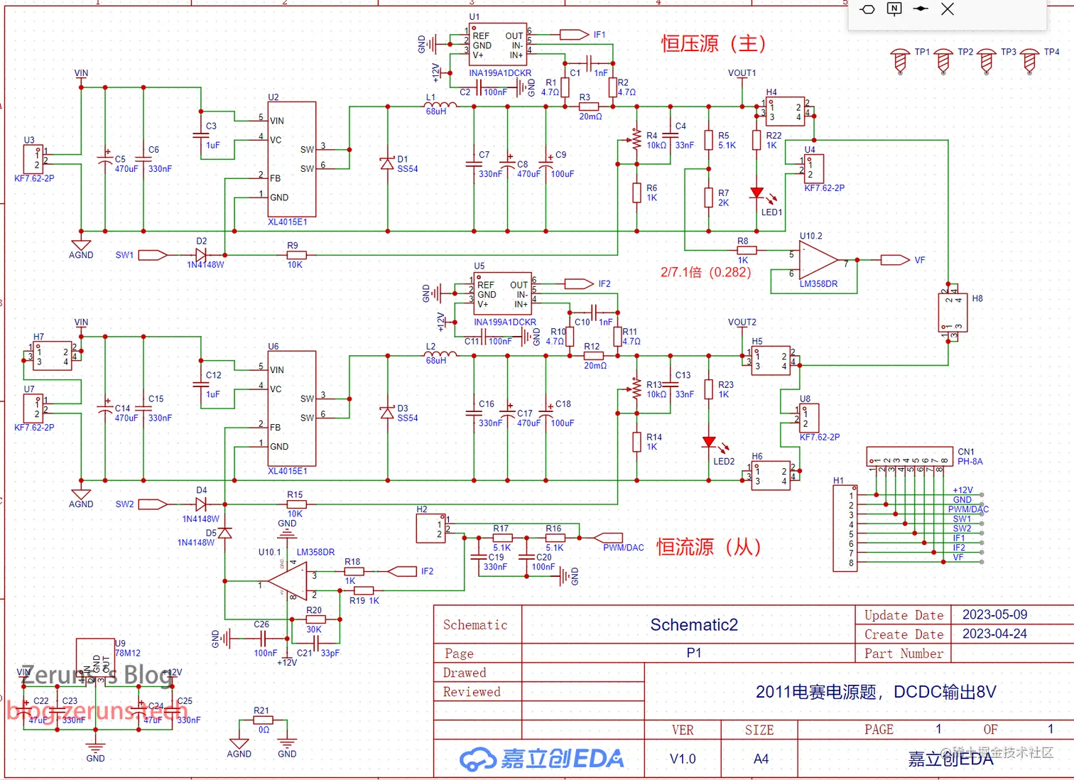 2011年全国电赛题-开关电源模块并联供电系统,两路XL4015芯片做DCDC模块输出8V,采用主从均流法,可实现多种比例精确分配电流,效率在80%以上。