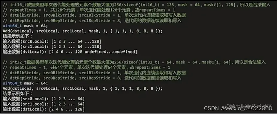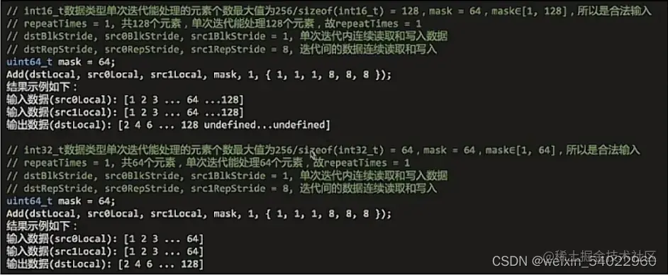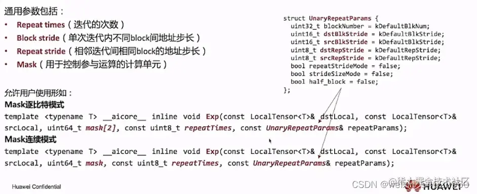 0级功能灵活计算接口,是最底层的开发接口,可以完整发回硬件优势的计算API,可以进行非连续计算,该功能可以充分发回CANN系列芯片的强大功能指令,支持对每个操作数的Block stride,Repeat stride,MASK的操作,允许用户使用诸多的通用参数来定制化所需要的操作: