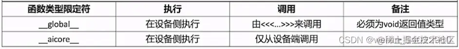 核函数的调用语句是C/C++函数调用语句的一种扩展。不同于常见的function_name(argument list)函数调用方式,核函数使用内核调用符<<<...>>>这种语法形式,来规定核函数的执行配置: