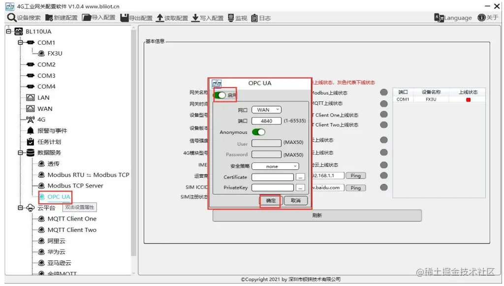 不仅仅实现opc ua功能,还可以通过4G、以太网上,对接公有云、阿里云、华为云、Thingsboard等9个平台。