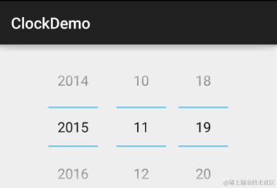 - android:datePickerMode:组件外观,可选值:spinner,calendar 前者效果如下,默认效果是后者
