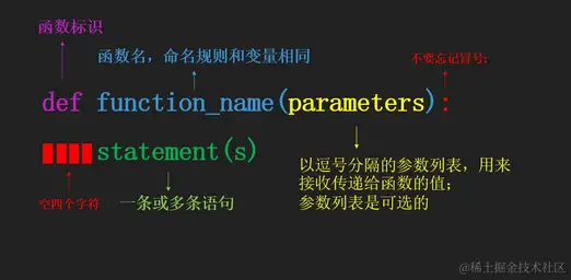 def标识函数头的开始。 function_name为函数名,命名规则和变量相同。parameters以逗号分隔的参数列表,用来接收传递给函数的值,参数列表是可选的。虽然参数列表是可选的,但是函数名后面的括号是必须的。:标识函数头的结束。statement(s)组成函数体的一条或多条语句,这些语句必须是相同的缩进(一般是缩进 4 个空格)。