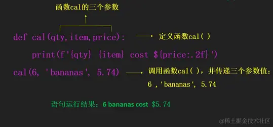 我们首先定义了一个函数 cal(),函数 cal() 中有三个参数,分别是参数 qty、参数 item 和参数price,当调用函数 cal() 时,传递三个参数的值 6,'bananas',5.74 给函数,最终运行结果为 6 bananas cost $5.74。