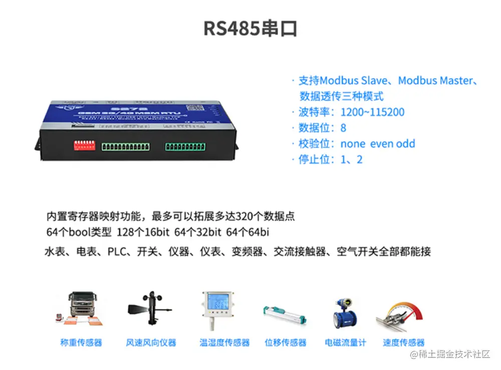 | 串行接口 | 1路RS485,支持Modbus Slave协议和Modbus RTU Master协议,可扩展320个数据点 |