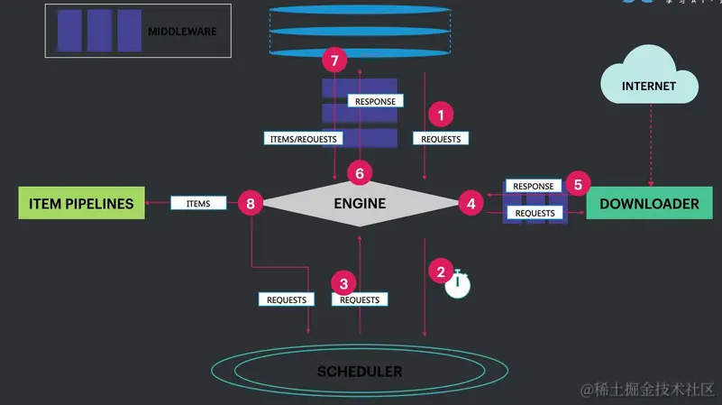 2. Scheduler:调度器从引擎接受request并将他们入队,以便之后引擎请求他们时提供给引擎。