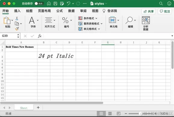 ws['B3'] = '24 pt Italic'