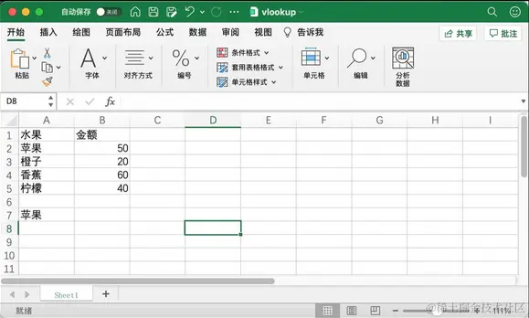 根据 A7 中的苹果查找到了金额 50。在公式 VLOOKUP(A7,A1:B5,2,0) 中,第一个参数 A7 是要查找的值;第二个参数 A1:B5 为要在其中查找值的区域;第三个参数 2 为查找值所在列的列号;第四个参数 0 为查找匹配项,近似匹配指定 TRUE(1),精确匹配指定 FALSE(0)。