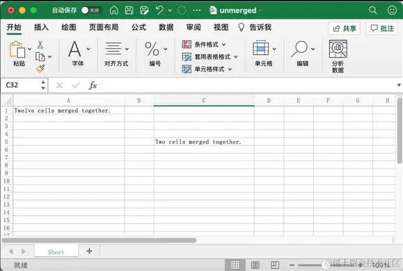 在上面的代码中,将合并后的单元格进行拆分。上面代码执行完成后的 Excel 文档如下图所示: