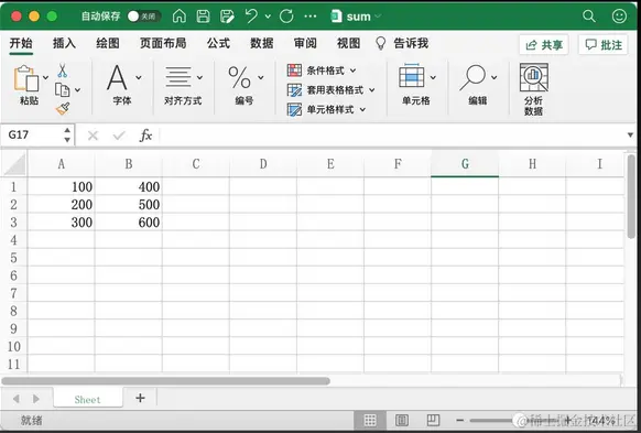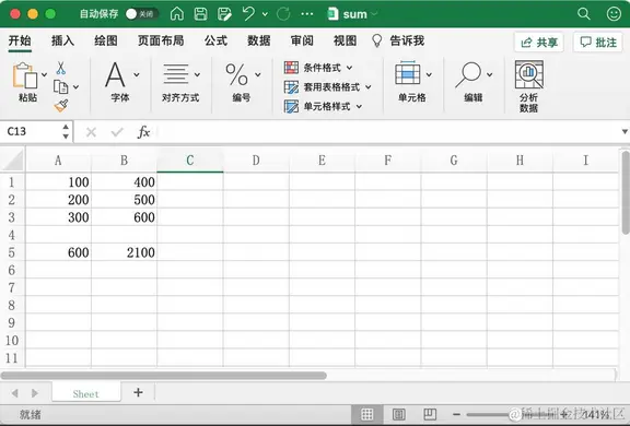 上面代码中,首先读取 Excel 文档 sum.xlsx 并获取活跃工作表;其次在单元格 A5 以及 B5 中分别写入公式 =SUM(A1:A3) 和 =SUM(A1:A3,B1:B3);最后对 Excel 文档进行保存。运行上述代码之前的文档如下图所示: