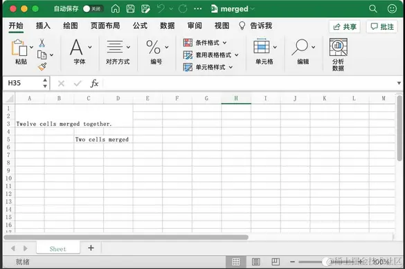 在上面的代码中,首先将 A1:D3 矩形区域内的单元格进行合并,其次将 C5 和 D5 单元格进行合并。上面代码执行完成后的 Excel 文档如下图所示: