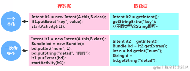 【创作赢红包】Activity初窥门径 芯动大师 2023-05-30 46 阅读1分钟 上一节中我们对Activity一些基本的概念进行了了解,什么是Activity,Activity的生命周期,如何去启动一个Activity等,本节我们继续来学习Activity,前面也讲了一个App一般都是又多个Activity构成的,这就涉及到了多个Activity间数据传递的问题了,那么本节继续学习Activity的使用!另外关于传递集合,对象,数组,Bitmap的我们会在Intent那里进行讲解,这里只介绍如何传递基本数据! 1.Activity间的数据传递 代码示例: