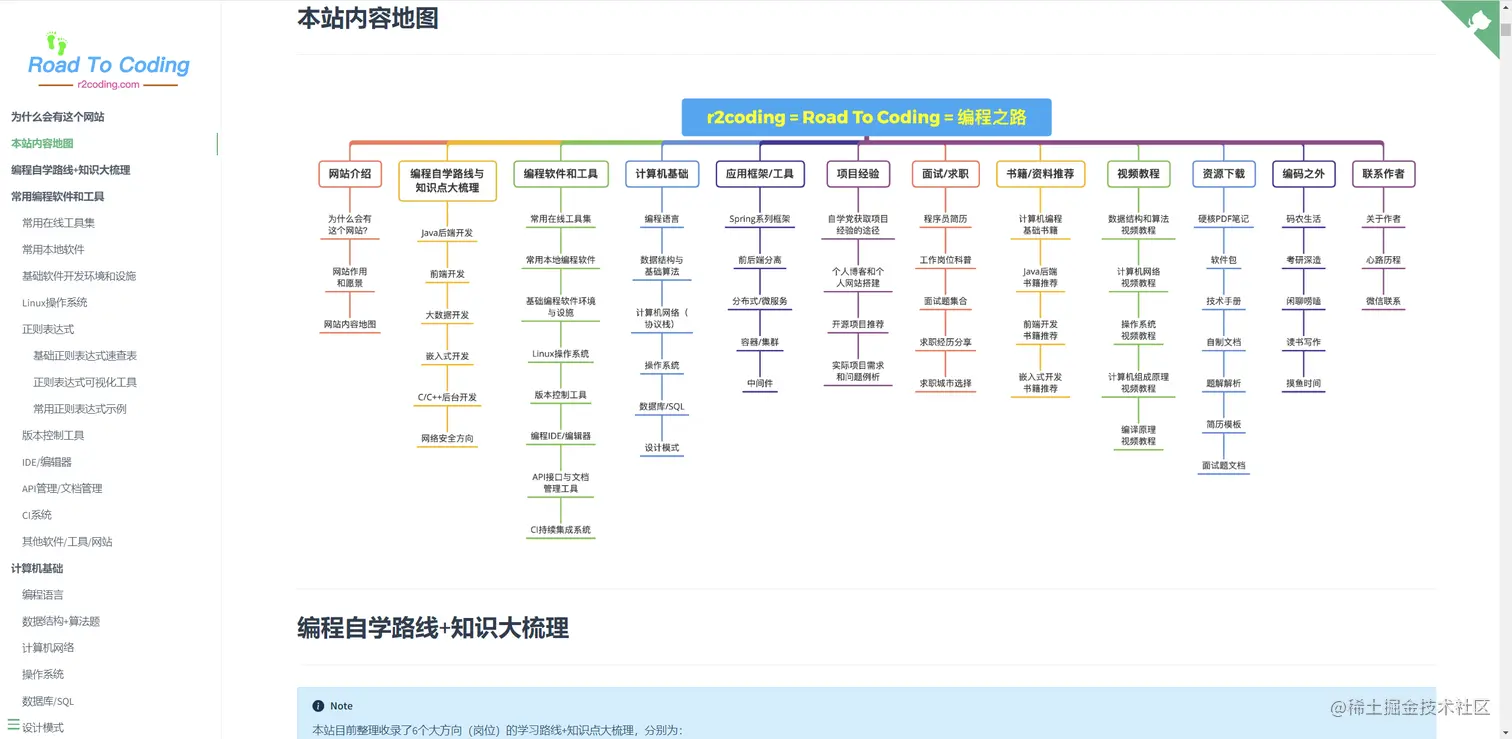 项目简介:本站取名为 r2coding,即 Road To Coding,意为编程自学之路,是自学编程以来所用资源和分享内容的大聚合。旨在为编程自学者提供一系列清晰的学习路线、靠谱的资源、高效的工具、和务实的文章,方便自己也方便他人。网站内容会持续保持更新,欢迎收藏品鉴!