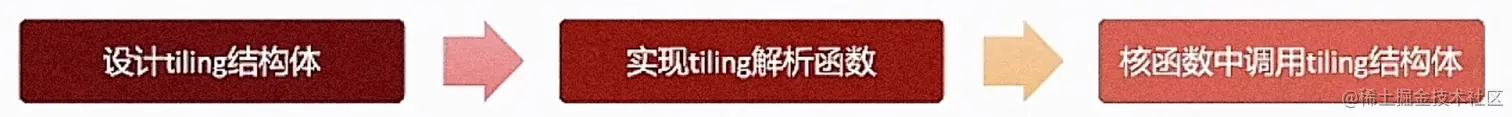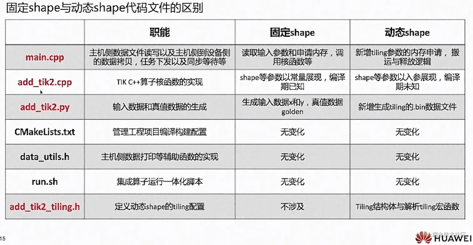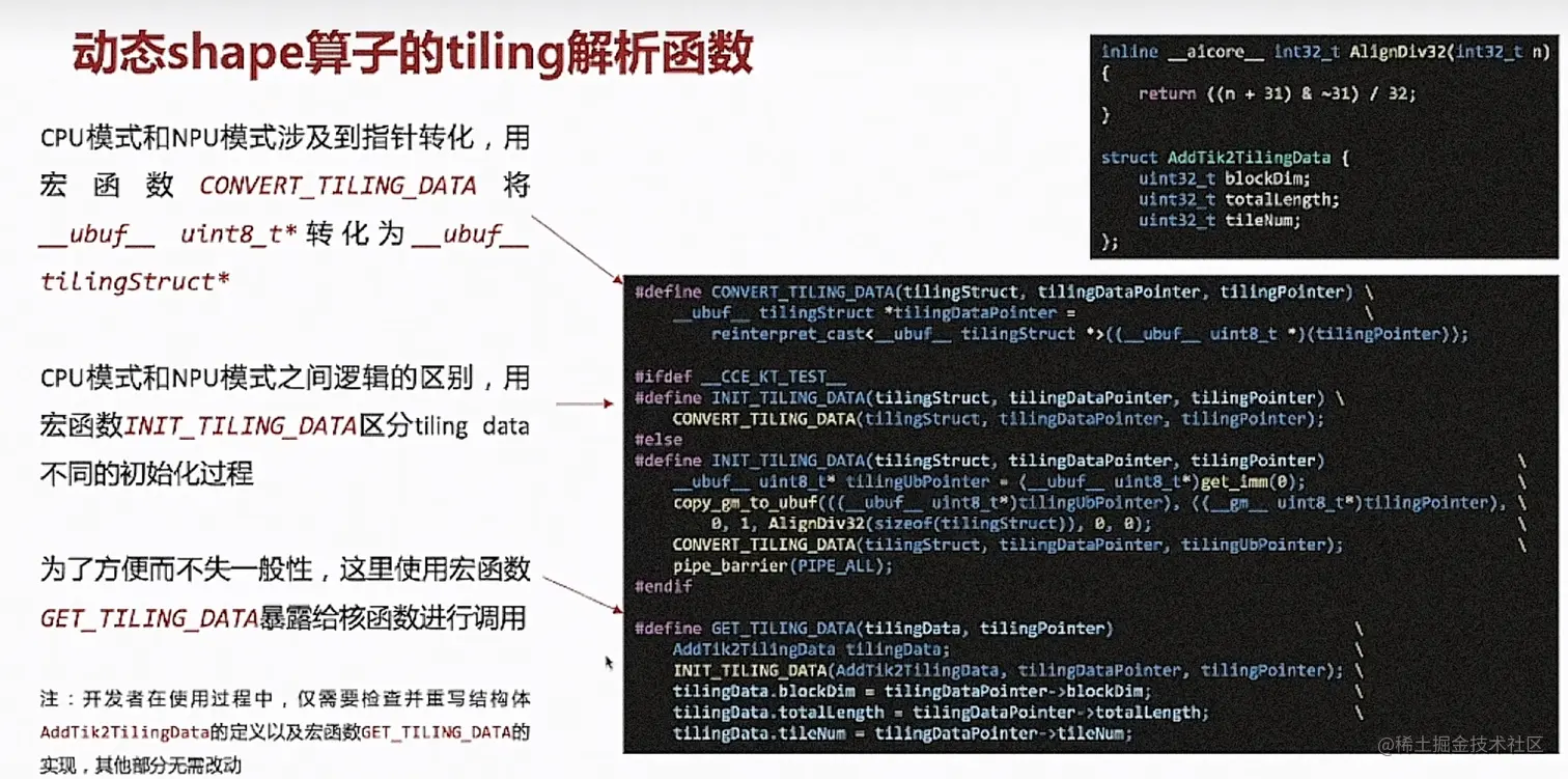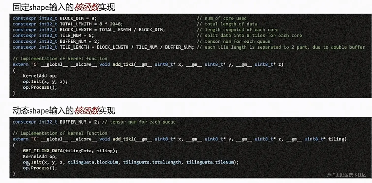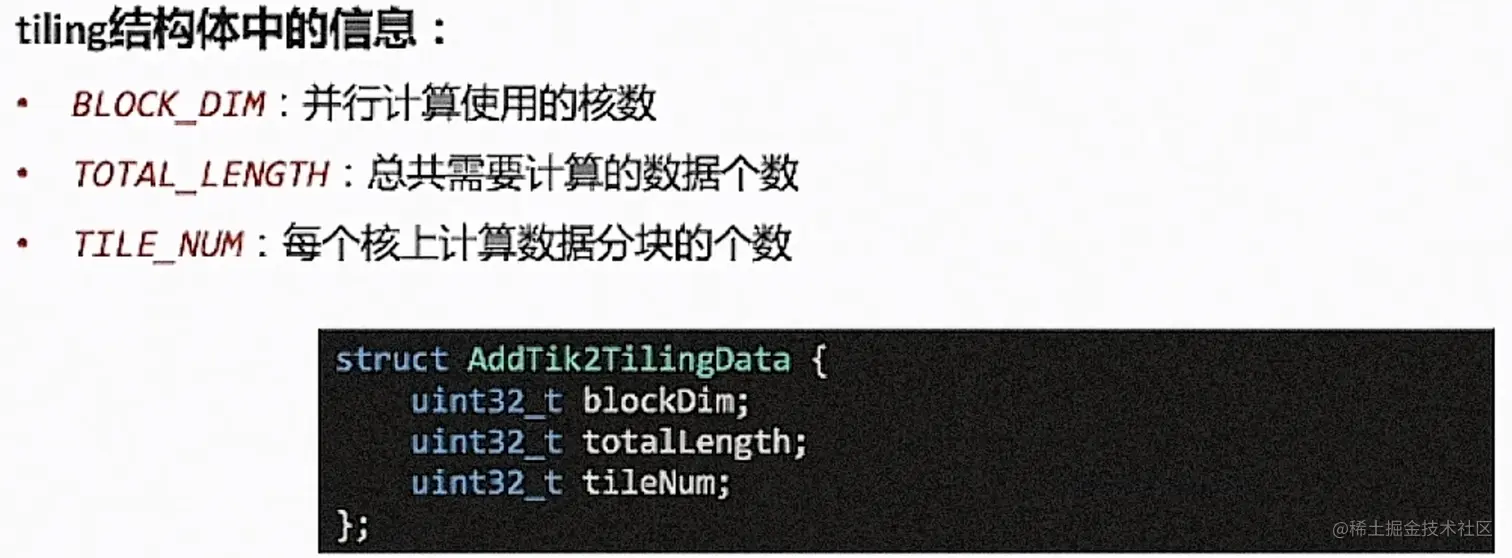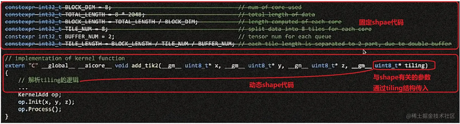 课程的第二次课,讲述是采用固定shape的加法示例,本次课讲述,如何将固定shape改为动态shape的算子。也就是,将控制形状的BLOCK DIM,TOTAL LENGTH,TILE NUM这些变量做成tiling结构体,作为参数传给核函数。如下图所示: