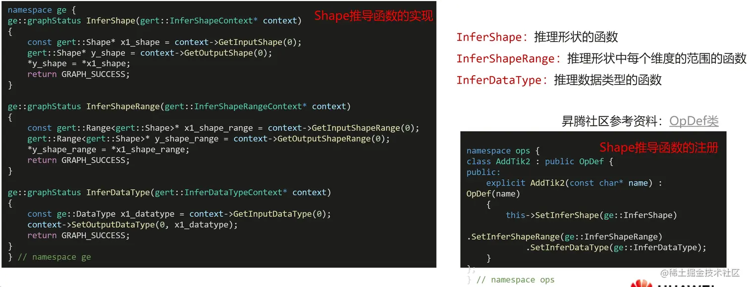 根据算子的输入张量描述、算子逻辑及算子属性,推理出算子的输出张量描述,包括张量的Shape,数据类型及数据排布格式等信息。这样算子构图准备阶段就可以为所有的张量静态分配内存,避免动态内存分配带来的开销。