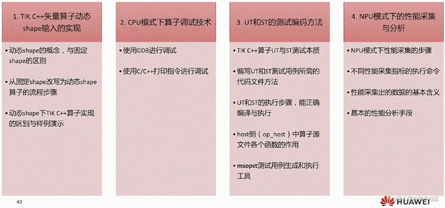 第三节课的主要内容,是掌握端到端的TIK C++算子开发流程。掌握TIK C++矢量算子动态shape输入的实现;掌握cpu模式下的算子调试技术;掌握UT和ST的测试编码方法;了解NPU模式下性能采集与分析。