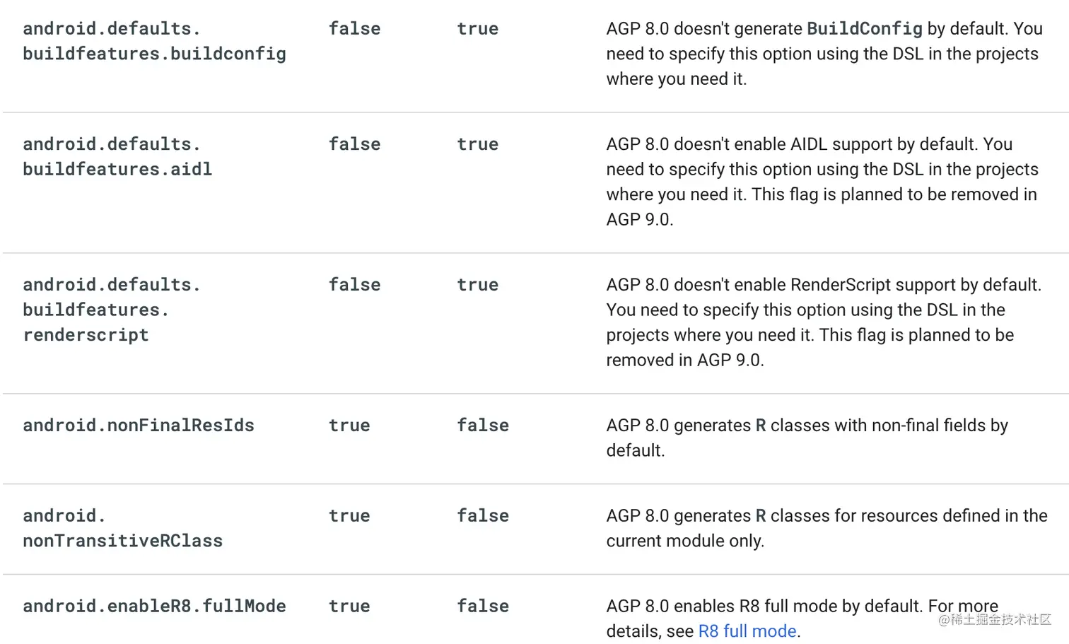 如下图所示,AGP 8 里一些默认配置参数进行了调整,基本上这部分也是导致项目升级 AGP 8 跑不起来的「元凶」之一。