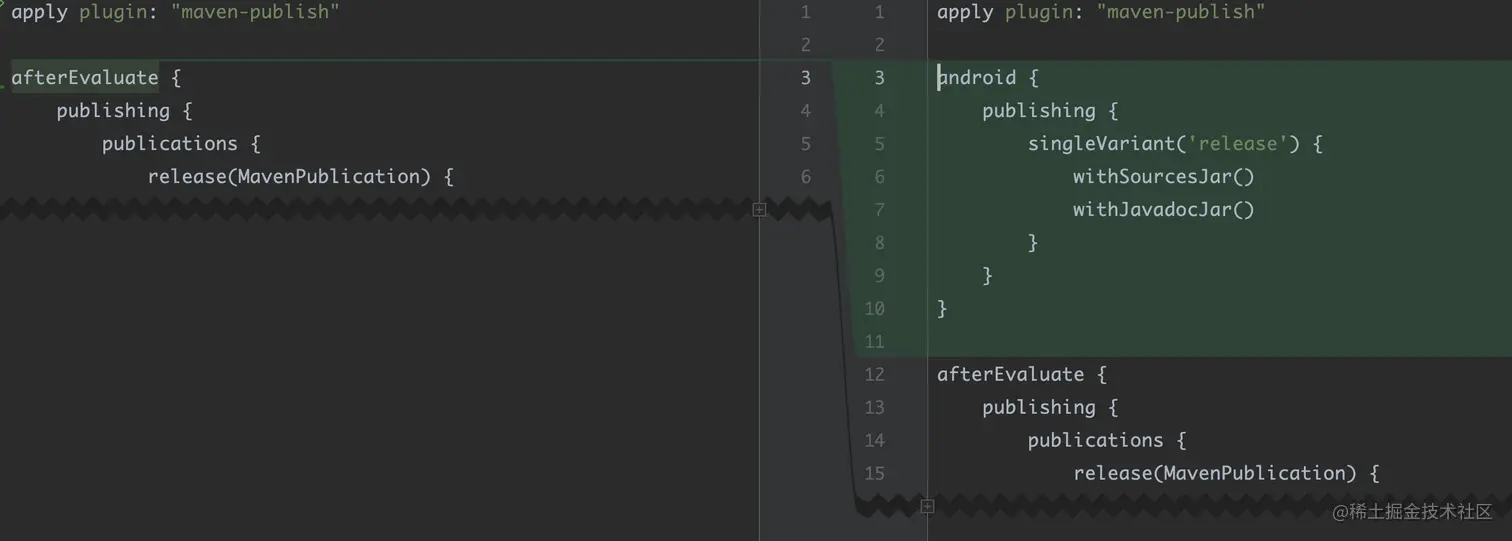 另外,在做 Maven 发布的时候,需要添加对应的 singleVariant 来支持 publications 的兼容,虽然这不是 AGP 8 才开始的,但是也算是需要适配的点之一。