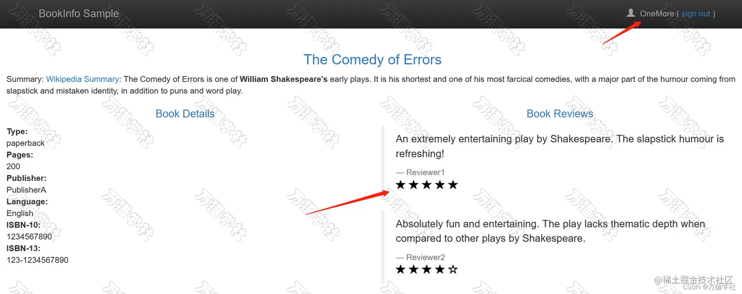 调整后,没有错误信息了,点击“Update”。使用 OneMore 登录后,访问productpage页面,可以看到使用黑色星形图标来显示评分信息的页面,如下图: