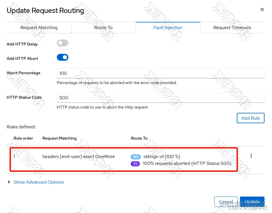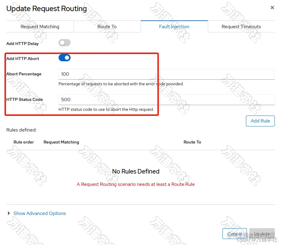 选择“Fault Injection”标签页,开启“Add HTTP Abort”,修改“HTTP Status Code”为500,如下图: