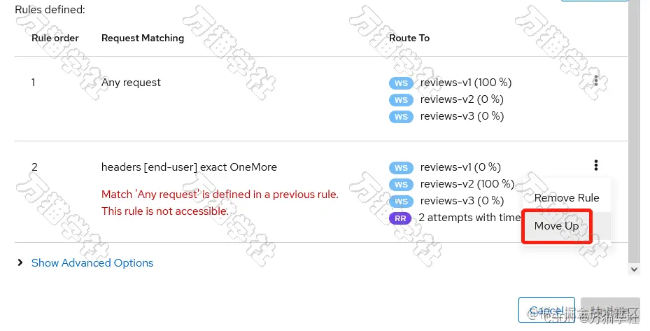 仍然进入reviews 服务的Services页面,点击“Actions”后,点击“Request Routing”。