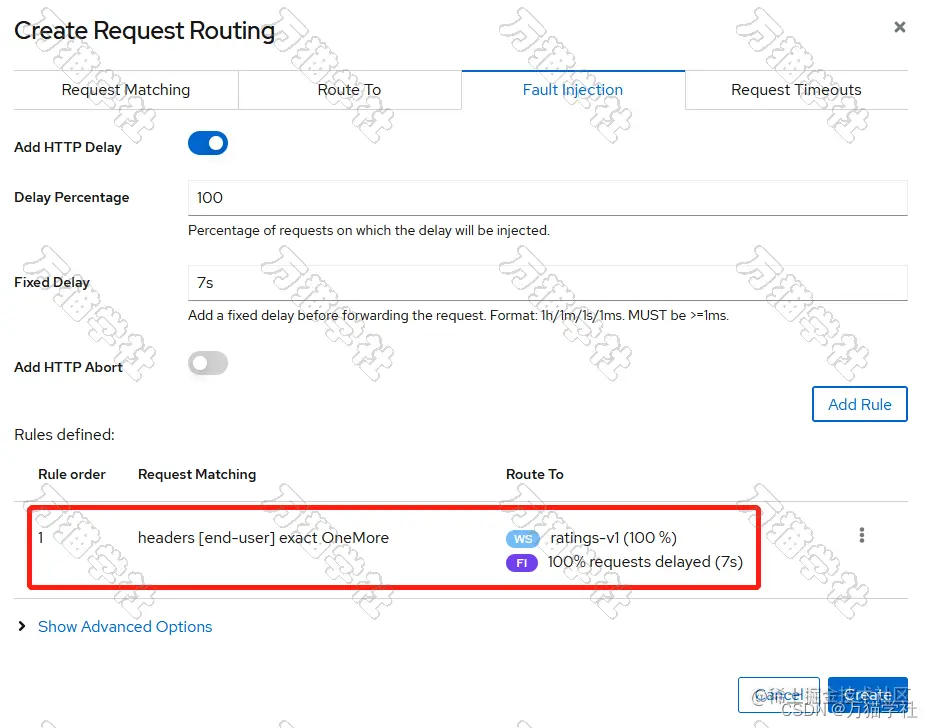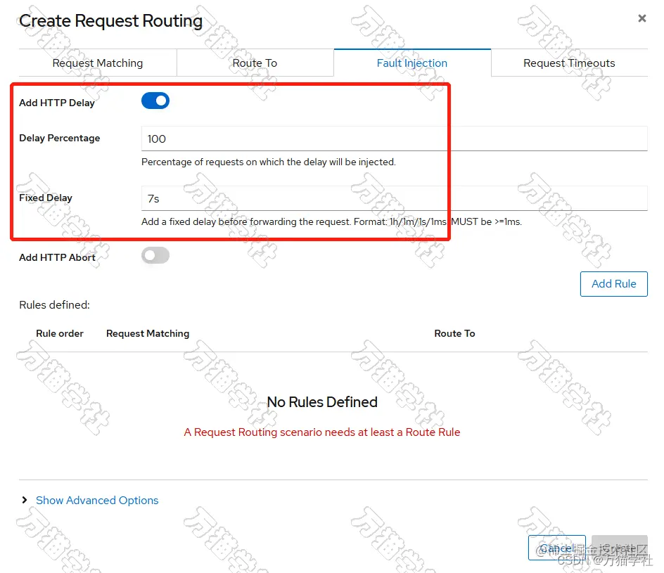 选择“Fault Injection”标签页,开启“Add HTTP Delay”,修改“Fixed Delay”为7s,如下图: