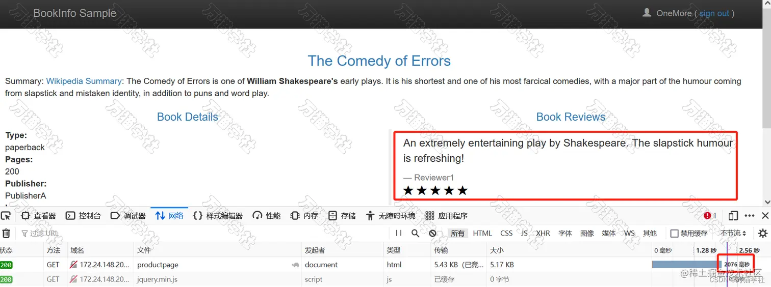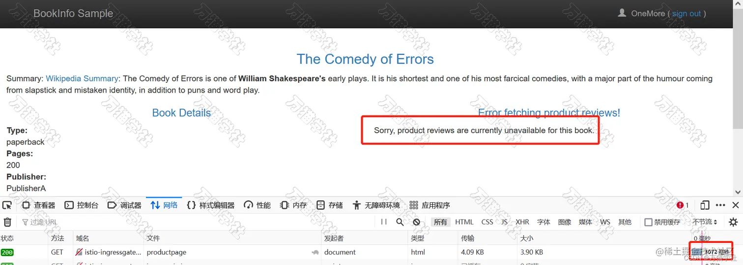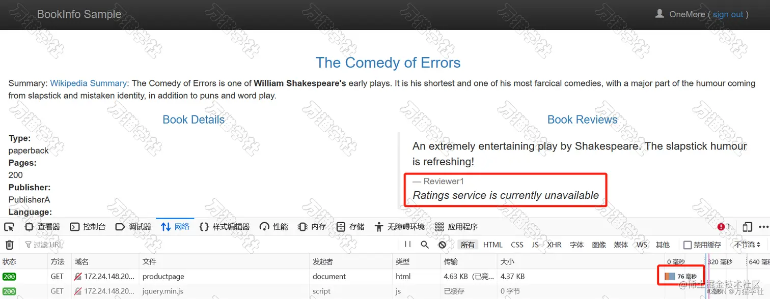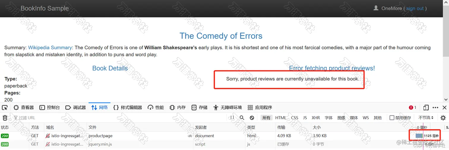 首先,用户 OneMore 访问时, ratings 服务注入一个 2 秒的延迟,productpage页面在大约 2 秒钟加载完成并且没有错误。