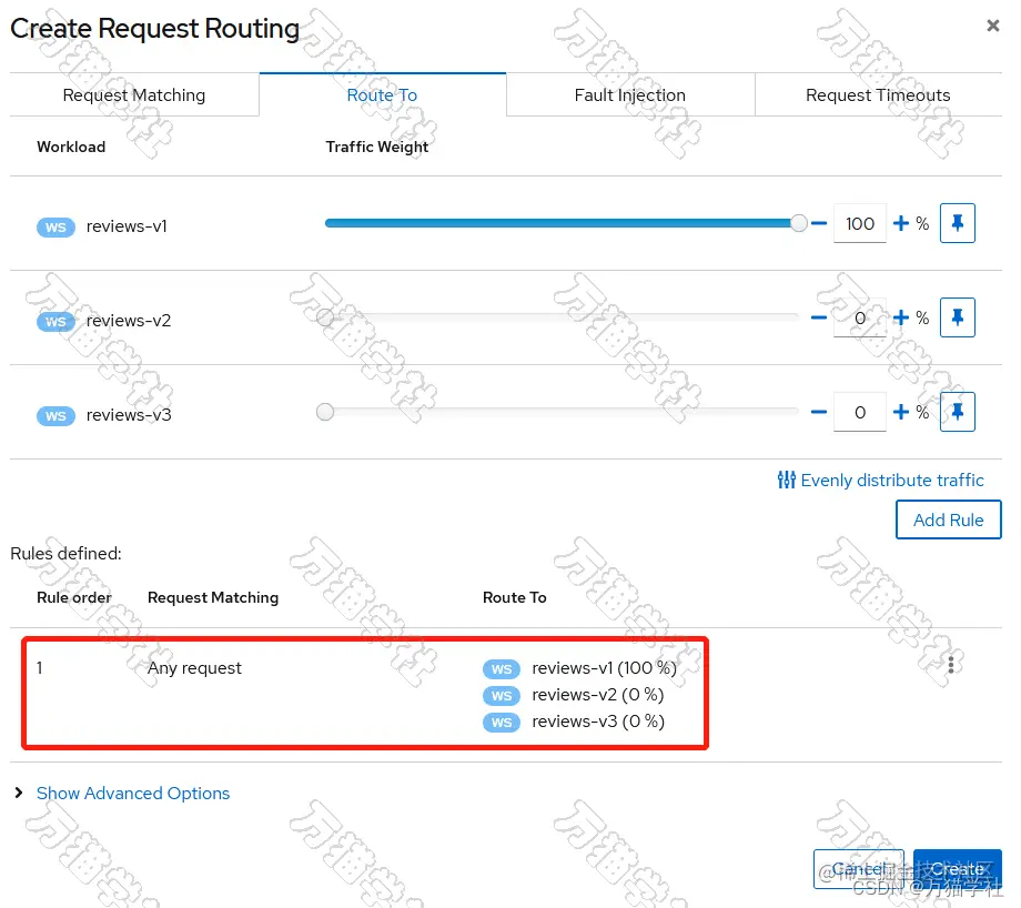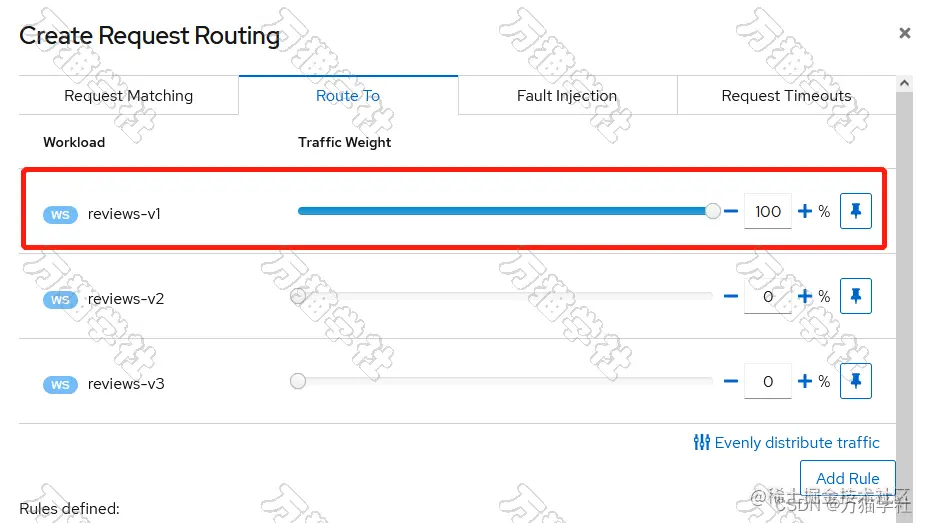 在“Create Request Routing”的弹窗中,选择“Route To”标签页,把reviews-v1的权重调节到100%,如下图: