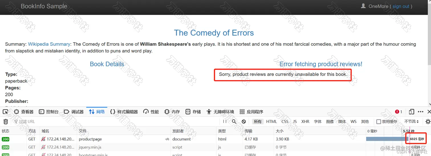 reviews服务的请求超时设置为 0.5 秒,同时显示 “Sorry, product reviews are currently unavailable for this book.” 这样的消息。