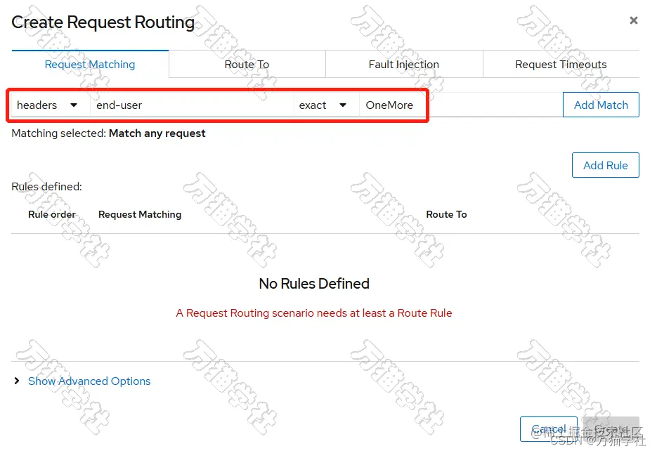 在“Create Request Routing”的弹窗中,选择“Request Matching”标签页,进行如下配置: