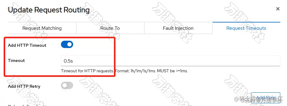 选择“Request Timeouts”标签页,开启“Add HTTP Retry”,修改“Attempts”为2,修改“Per Try Timeout”为0.5s,如下图: