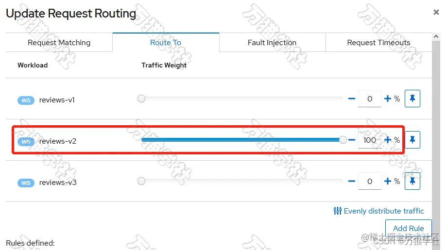 选择“Route To”标签页,把reviews-v2的权重调节到100%,如下图: