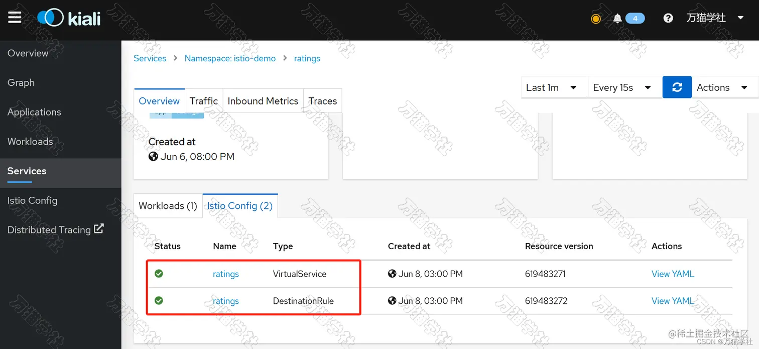 点击“Create”按钮,对应的虚拟服务(Virtual Service)和目标规则(DestinationRule)就创建好了,如下图: