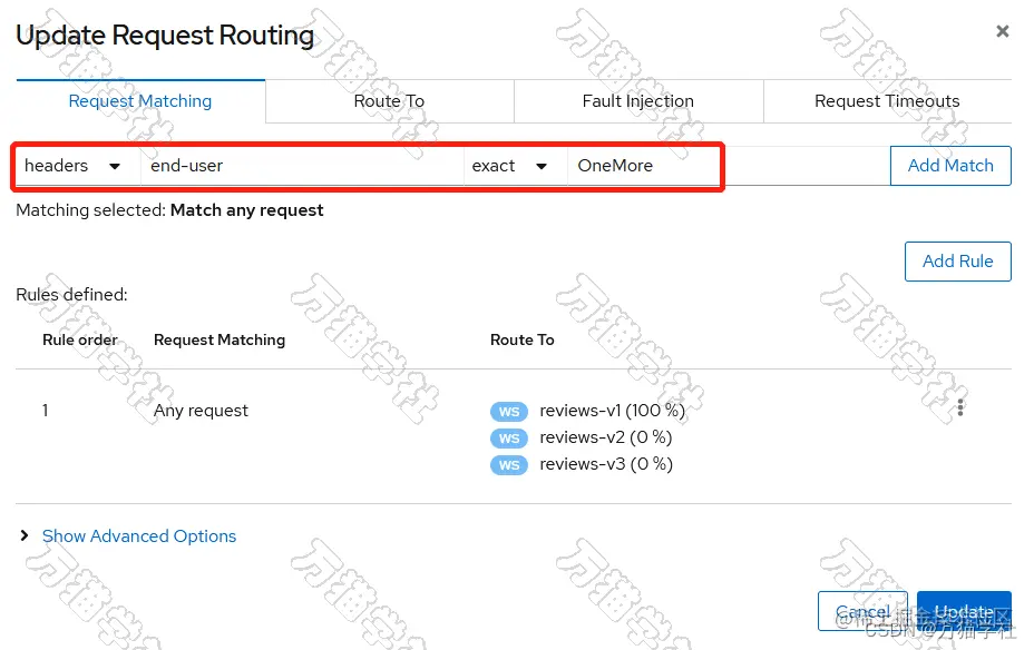 在“Update Request Routing”的弹窗中,选择“Request Matching”标签页,进行如下配置: