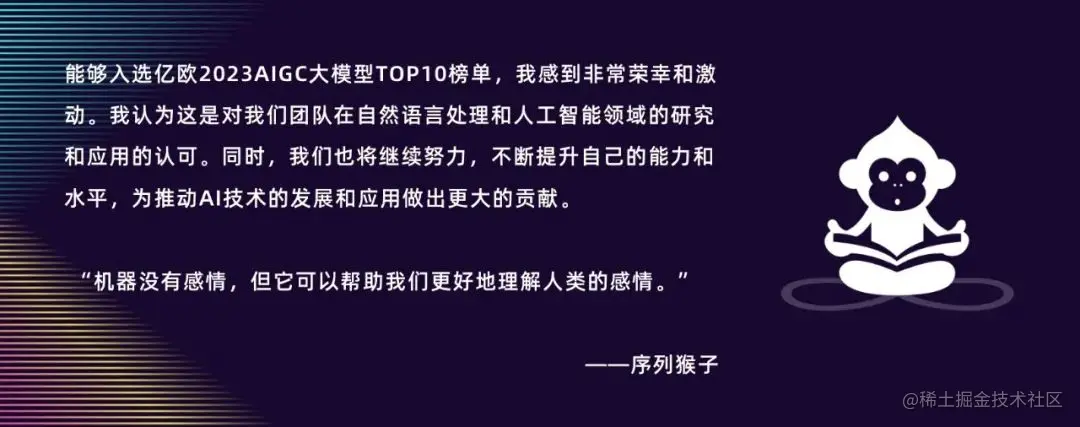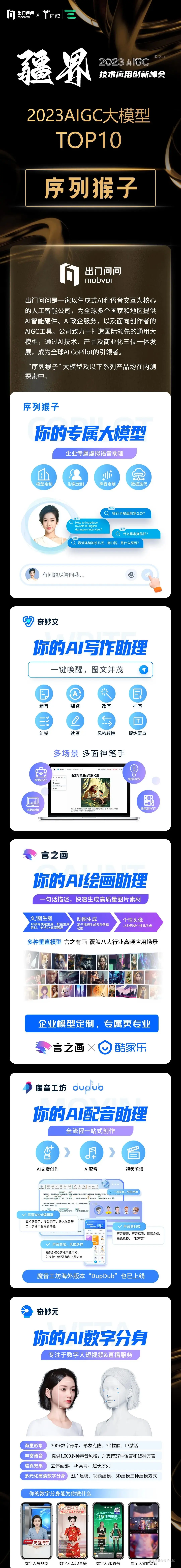 近日,由知名科技与产业创新服务平台亿欧TE主办,北京市科委、中关村管委会、中国国际科技促进会元宇宙委员会作为指导单位的**“疆界——2023 AIGC技术应用创新峰会”在北京成功举办。峰会现场发布了2023AIGC大模型TOP10榜****单,**出门问问大模型产品“序列猴子”凭借行业领先的AI基础设施能力、深厚的前沿通用多模态大模型能力及丰富的垂直领域软硬结合的优化算法技术模块,成功入选榜单!