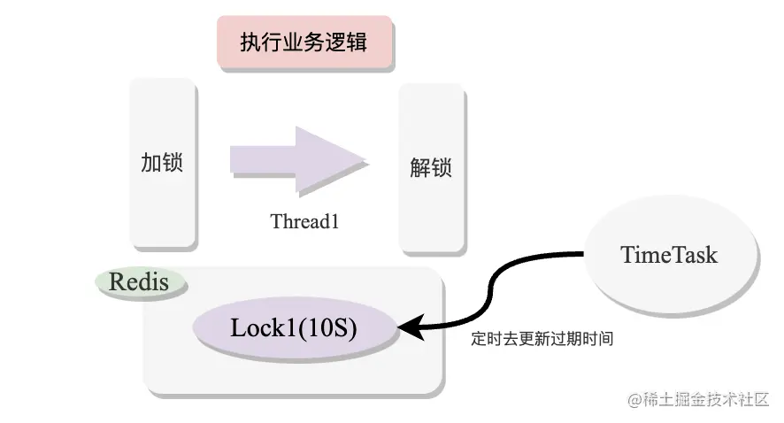 对于上述的这种情况,原因是由于设置的过期时间太短或者业务执行时间太长导致锁过期,但是为了避免死锁问题又必须设置过期时间,那这就需要引入自动续期的功能,即在加锁成功时,*开启一个定时任务,自动刷新Redis加锁key的超时时间, *从而避免上诉情况发生,如下图所示: