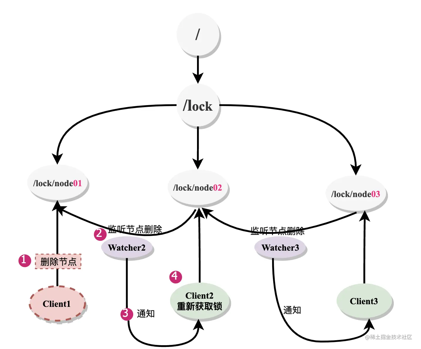 (3)如果加锁次数等于0,则释放锁,删除掉创建的临时节点,下一个监听这个节点的客户端会感知到节点删除事件,从而重新去获取锁