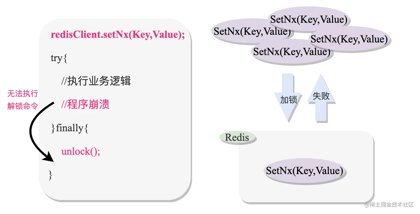 上面的setNx命令实现了基本的加锁功能,但存在一个致命的问题是,当程序在执行业务代码崩溃时,无法再执行到下面的解锁指令,从而导致出现死锁问题